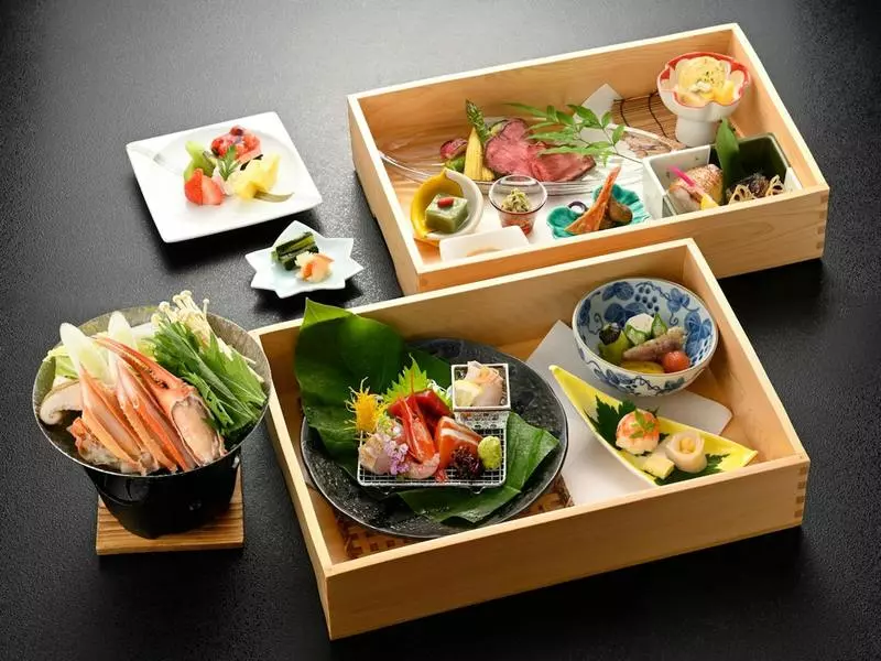 ホテルでは、厳選された旬の山海を使った日本料理を堪能!2020年ミシュラン新潟にて三つ星を受賞したプロの板前が、地元の食材を使い本格的な日本料理を調理してくれます(※)。