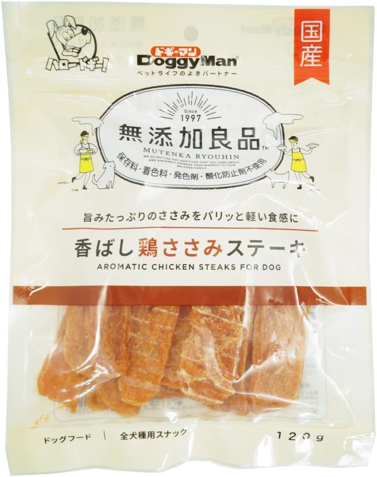 ドギーマンの「無添加良品 香ばし鶏ささみステーキ」は、鶏本来の旨さを味わえるおやつ。ササミを練ってシート状にしています。