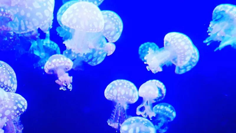 クラゲも美しい。透き通るゼリーのように泳ぐ姿は観ていて飽きないくらい。ドット柄のかわいいクラゲの他、照明の色が変わる水槽にはミズクラゲも。