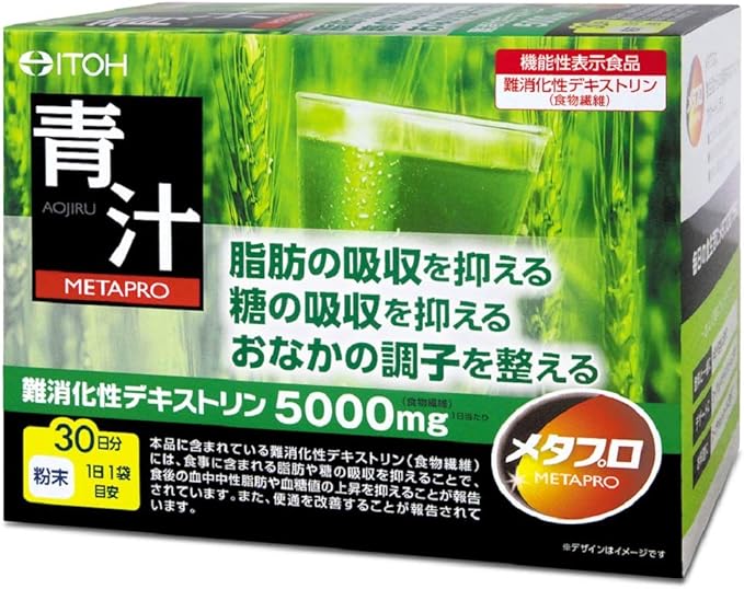 続いて紹介するのは「井藤漢方製薬 メタプロ青汁」です。体に良い飲み物といえば青汁を思い出す人も多いのではないでしょうか。1包あたり5000mgの難消化性デキストリンを配合する機能性表示食品です。(※"井藤漢方製薬 公式HP"参照)