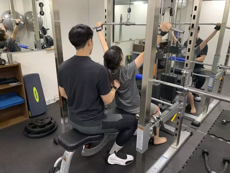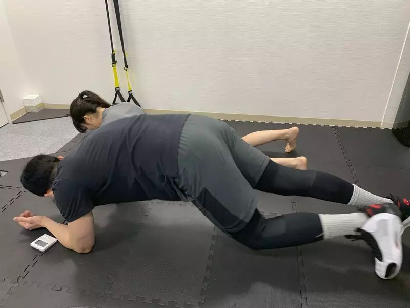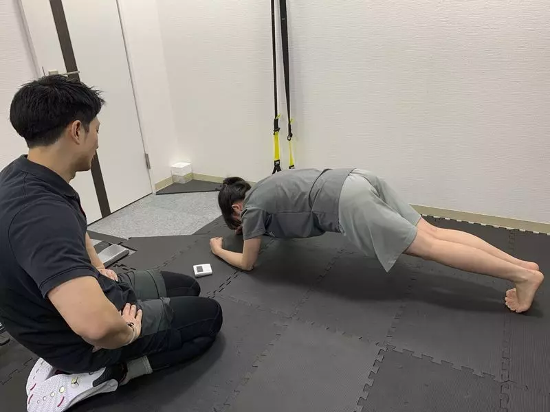 最初は宇藤さんが手を添えながら正しい姿勢でトレーニングできるようサポートしてくれます。