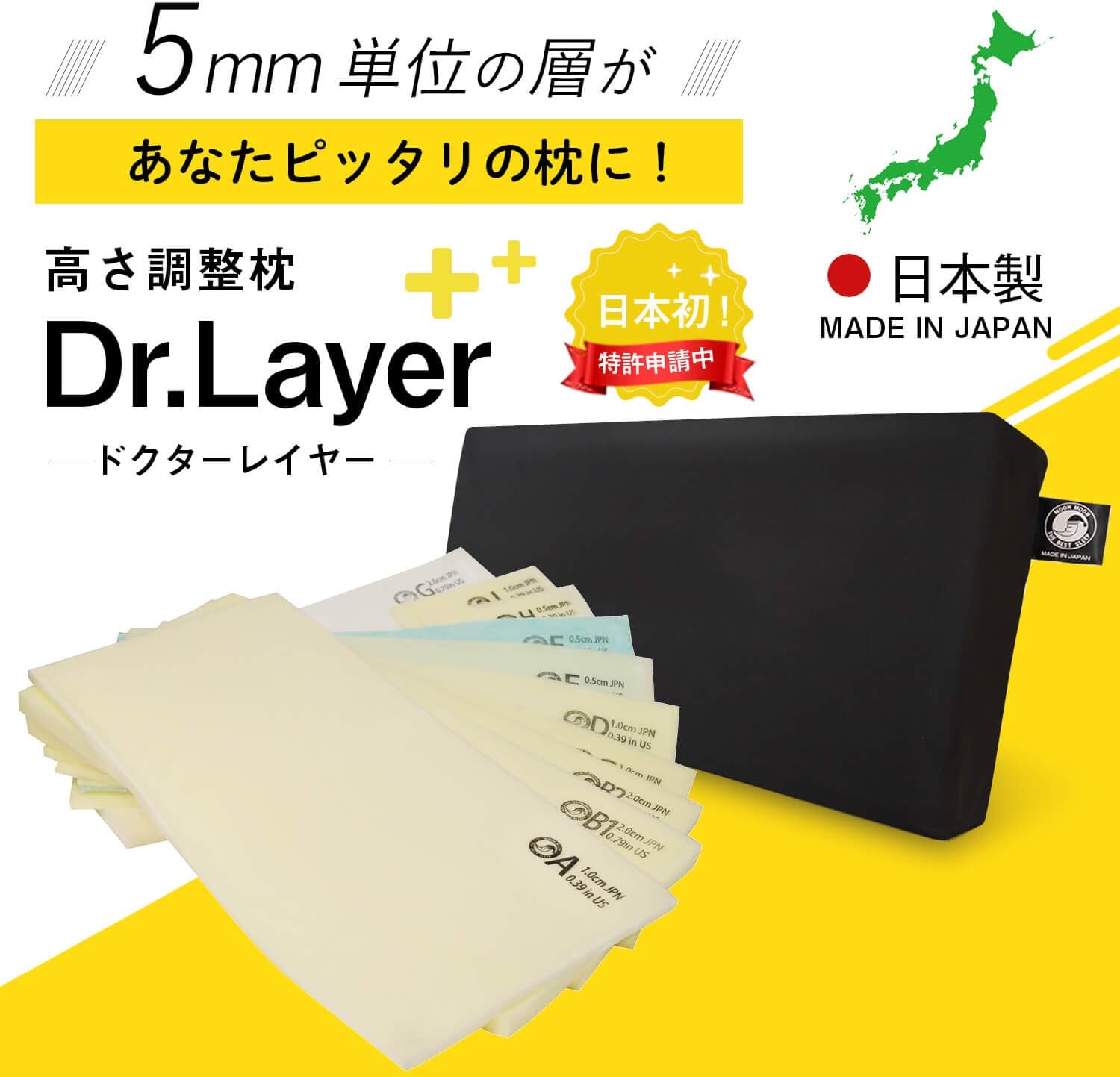 MOONMOONのDr.Layer オーダー枕は、ハードタイプ、ソフトタイプの2種類があり、その上で5mm単位の層で自宅でも簡単かつ細かく枕の高さを調整することができます。