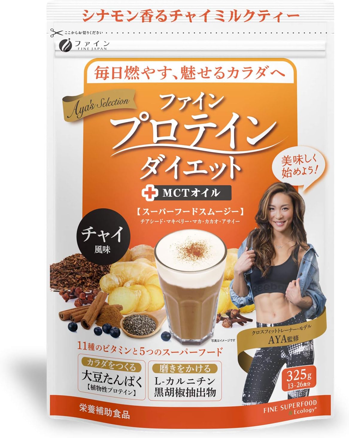 また美容にこだわるAYAさんならでは、不足しがちな11種類のビタミンとスーパーフード「チアシード」「マカ」「アサイー」「マキベリー」「カカオ」の5種類もプラスされていて、他にはない配合が楽しめます。(※"ファイン 公式HP"参照)