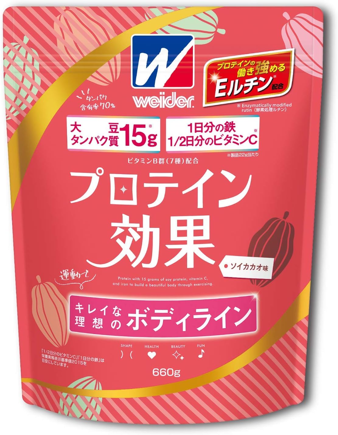 タンパク質だけでなく、女性に嬉しいビタミンやミネラルは配合されていて1食あたりのタンパク質は15.5g。他にはビタミンB群、鉄7.0mg、ビタミンC63mg、ビタミンE2.6mgが配合されています。(※"ウィダー 公式HP"参照)