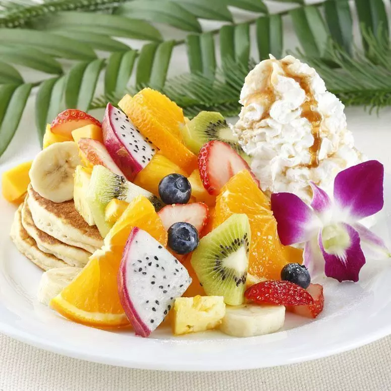 フルーツやクリームが乗ったハワイアンパンケーキも大人気のメニューです◎
