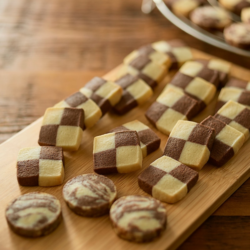 型が要らないので、普段あまりお菓子作りをしない方でも気軽に作れます。プレーンとココアの2種類の生地を使ってお好みの模様を作ってみてください。