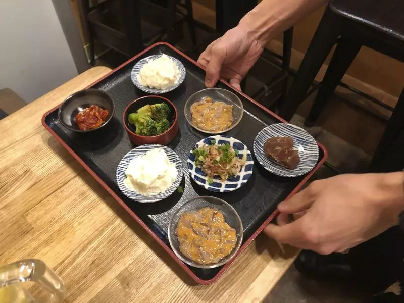 乾杯の後に、小皿でいっぱいのおぼんが到着。