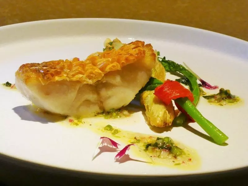 This is the 6th dish, Tilefish grill caught in Tsushima, Nagasaki Prefecture.It is served really brightly like a painting on a canvas.The feeling of the skin of tilefish will make you satisfied.