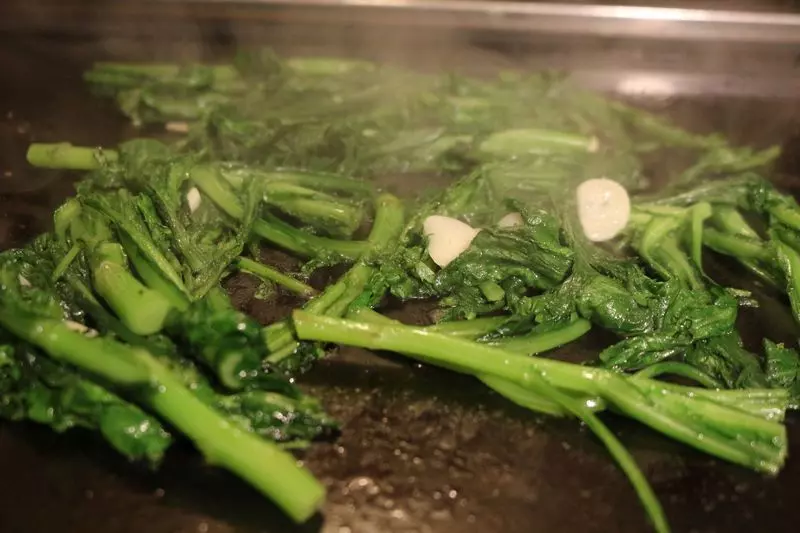 最初に注文したのは、今の時期が旬の春菊を使った「春菊にんにくバター醤油」¥500(税抜)。春菊を鉄板焼きで食べたことが無かったので、気になって注文しました。