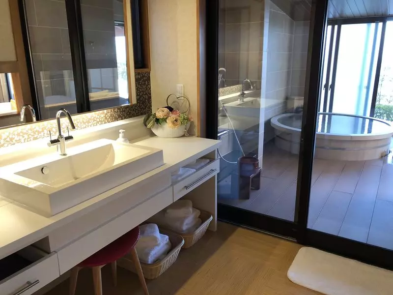 お風呂は檜風呂。檜の香りが漂ってきて、癒されます。半露天風呂になってるので扉をあければ露天風呂に。扉を全て閉めれば内風呂になります。