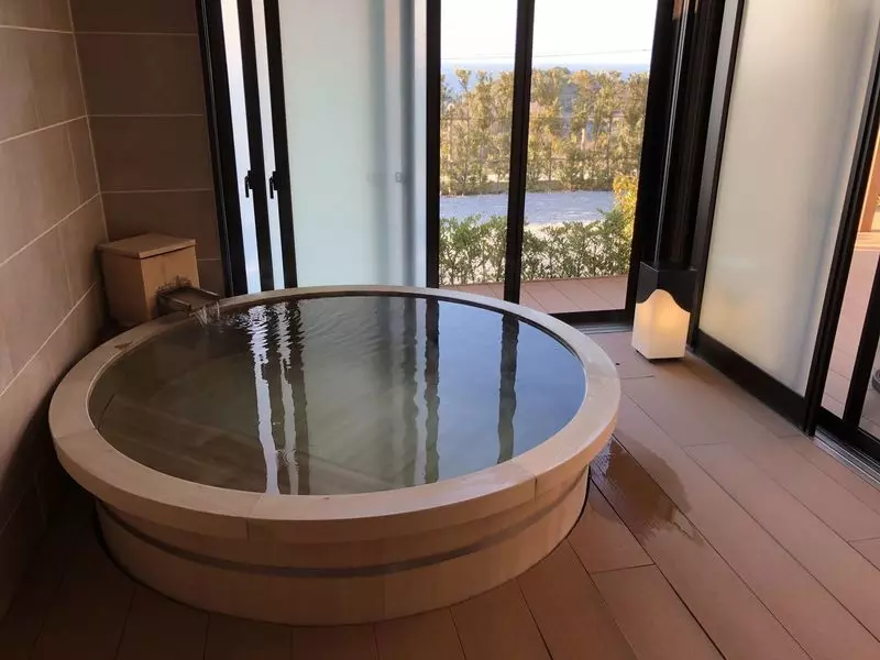 続いてご紹介するおすすめポイントは温泉!土肥温泉が引かれた「ふたりとわに 縁」は全室露天風呂付きで、夕空に浮かぶ富士山を眺めながら温泉を楽しんだり、満天に輝く星空の下で入浴なんてことも出来るんです。