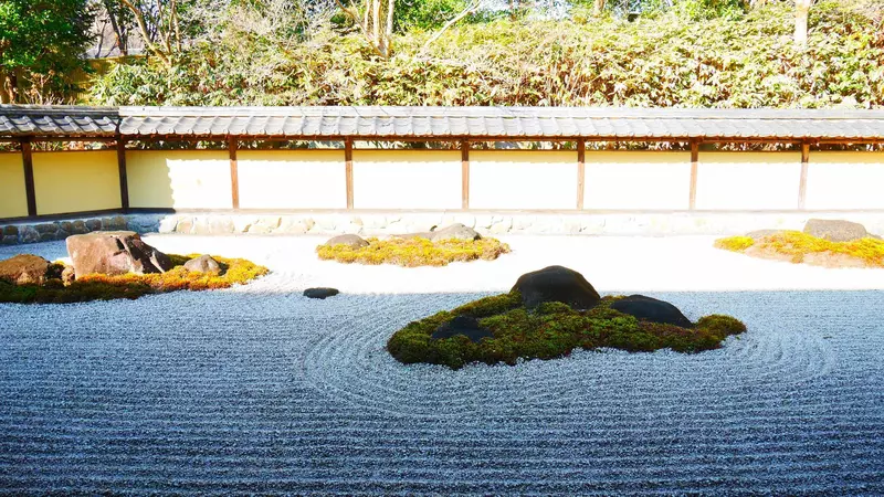 縁側に腰かけて日本らしい石庭の表現を楽しむことができます。注文すると、お抹茶を飲むこともできます。日常を忘れてゆっくりすごすひとときを。