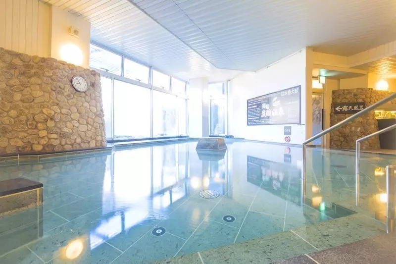 白いタイルと外の景色のコントラストが美しい内風呂では、炭酸温泉や源泉掛け流しを堪能することができます。