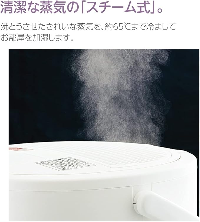 続いて紹介するおすすめの加湿器は、一度沸騰した水が蒸気に変わるので綺麗な蒸気で加湿できます。給水はふたを開けて上から水を注ぐだけ!間口が広くお手入れも簡単です。通常モードでは8時間連続加湿ができるので朝まで快適に眠れます。