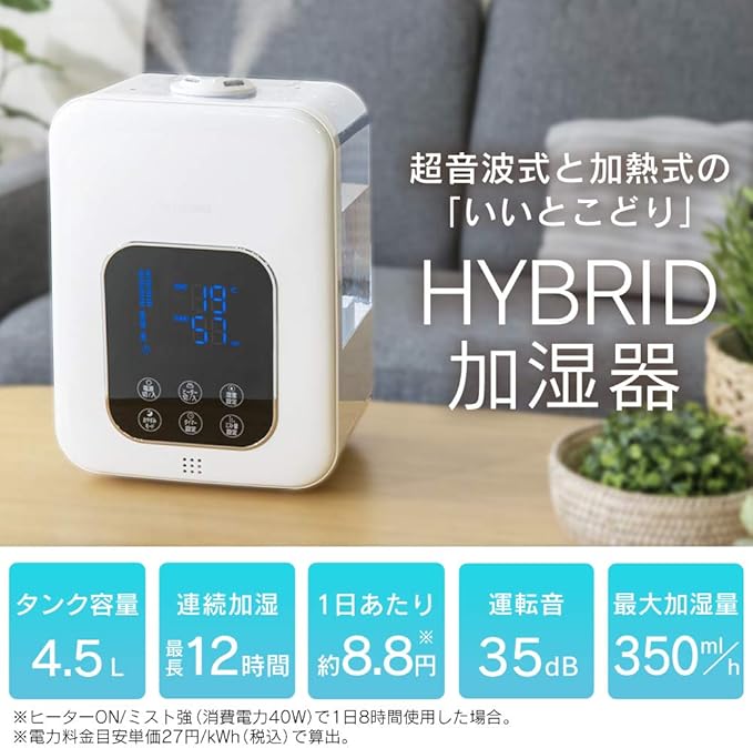 ハイブリッド式は、気化式もしくは超音波式にヒーターを組み合わせたタイプの2種類があります。導入の費用がかかる傾向にありますが、比較的電気代を抑えつつ稼働してくれるのが大きなポイント。