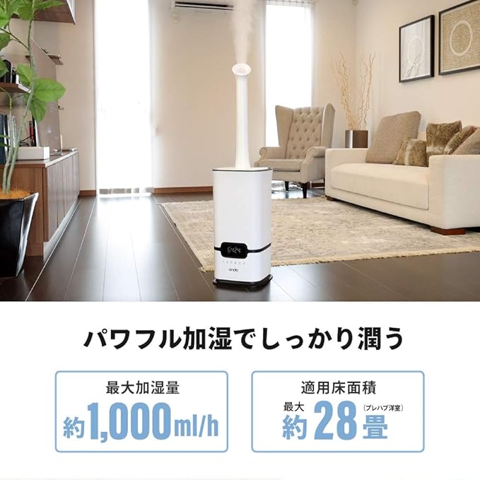 続いて紹介するおすすめの加湿器は、見た目は小型ですがミストの噴き上げ高さが約80cmもありパワフルです。ミスト調節量も4段階あり普段使いから睡眠モードまでさまざまなシーンに適します。
