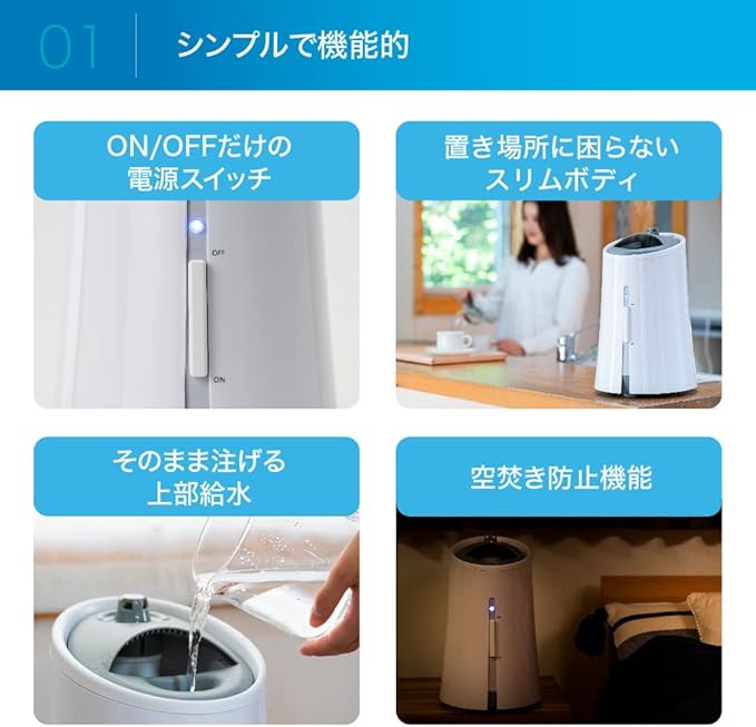 また、夜眠ってから朝起きるまで加湿し続けてくれるかも重要なポイント。水がなくなったら自動で停止するものや、タイマー機能がついてるものを選ぶのもひとつの手です。