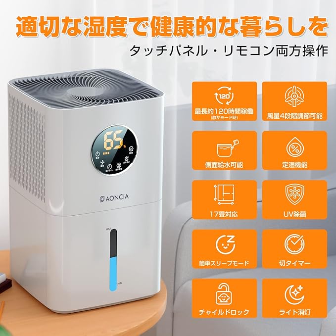 続いて紹介するおすすめの加湿器は、フィルターに水を浸透させ、ファンで風を送る帰化式加湿器は蒸気が出ず長時間の利用できます。AONCIAの加湿器はUV照射もついているのでキレイな空気で加湿できます。水道水のカルキやミネラルがつかないのでお手入れが簡単なのも良いポイントです。