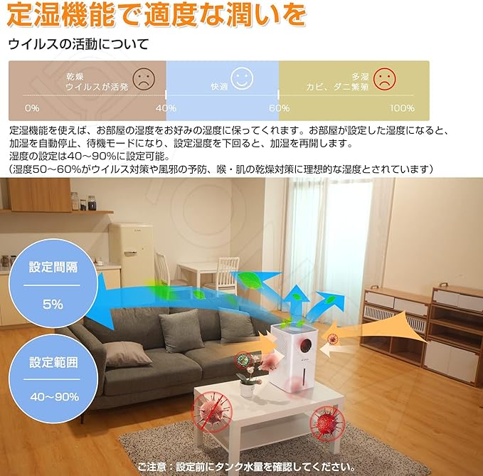 給水タイミングや給水頻度、連続加湿時間は使い勝手を左右するもの。タンクの容量が大きいほど給水の頻度が少なく済み、とくに睡眠時間の長い赤ちゃんや小さなお子さんがいる家庭には便利です。