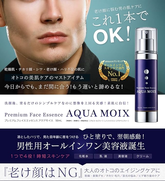 大人メンズの肌トラブルを1本でケアできる「プレミアムフェイスエッセンス アクアモイス(AQUA MOIX)【医薬部外品】」が、通常価格5,280円(税込)→ 初回限定【約81%OFF】980円(税込)で購入できるので、ぜひ気軽に試してみてください!