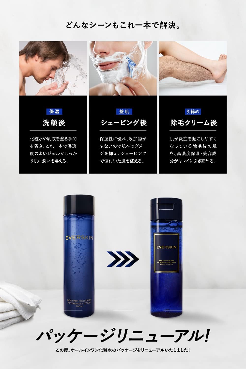 『EVERSKIN(エバースキン)』の「オールインワン アフターシェーブローション」は、化粧水、乳液、クリーム、美容液、アフターシェーブの5機能を1つにまとめたオールインワンローションです。