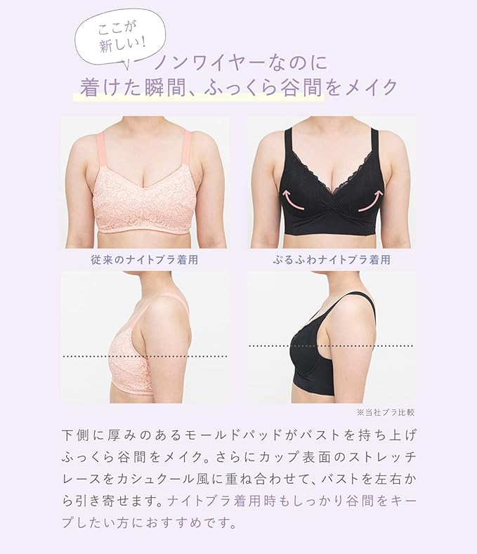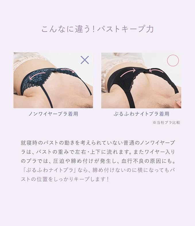 また40代はバストの垂れや離れが表面化してくる時期(※2)。ナイトブラはバスト全体を包み込んでキープしてくれる構造をしているため、寝ている間のバストの形崩れをケアする効果があります(※1)。