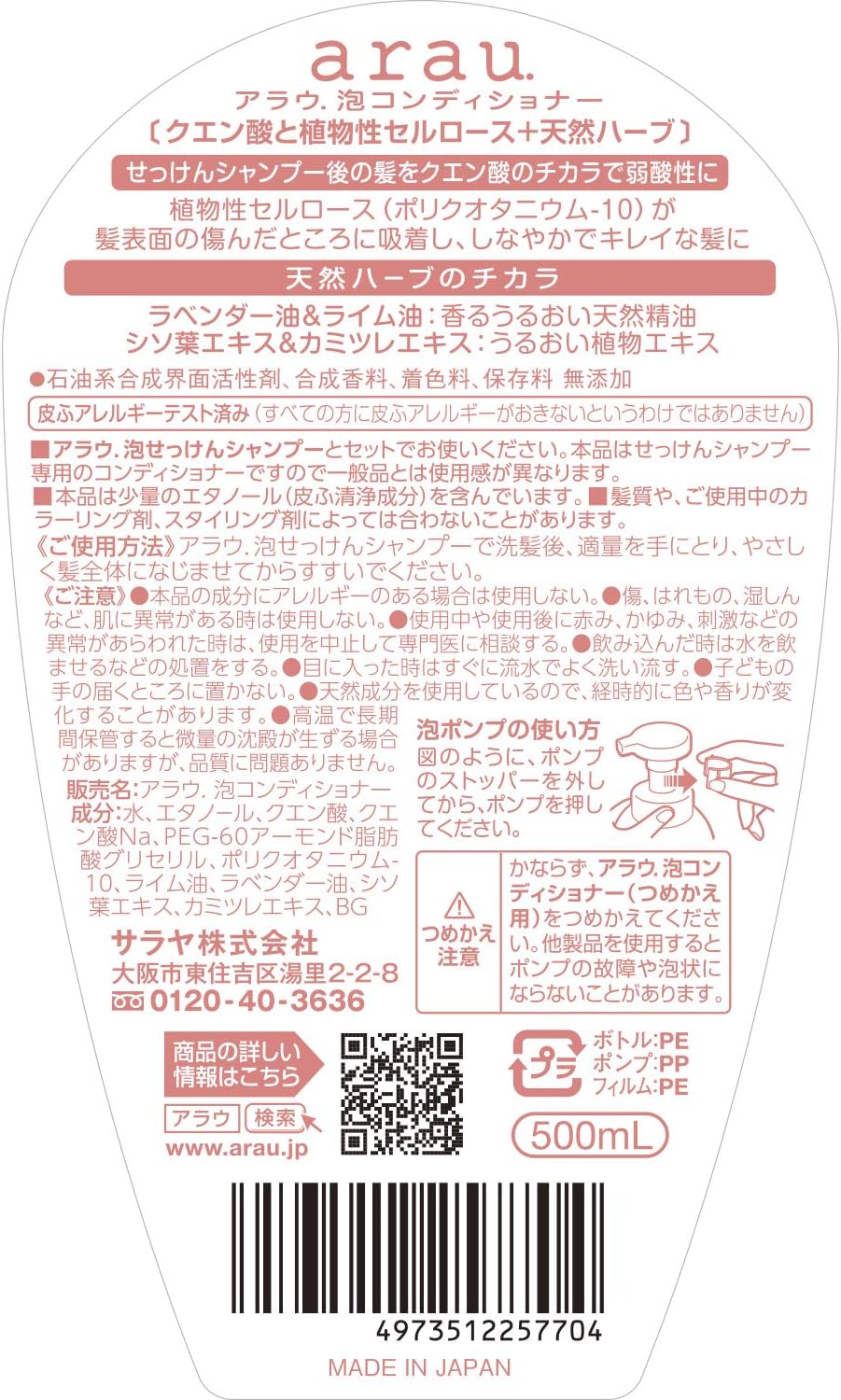 続いてご紹介するのはarau.(アラウ)「泡せっけんシャンプー」のセットのリンスの、「泡コンディショナー 本体 500ml」。こちらは合成着色料や合成界面活性剤不使用の、刺激の少ない設計が特徴の泡タイプのコンディショナーです。(※"arau. 公式HP"参照)