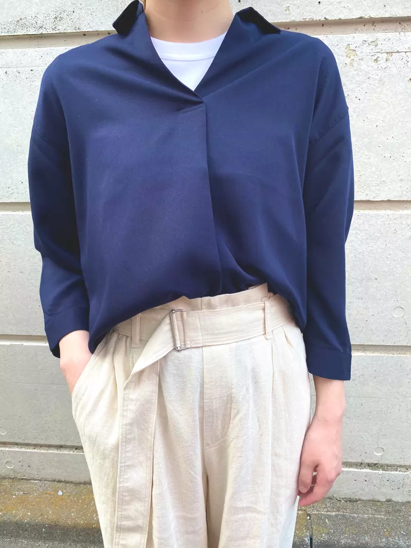 トップスは“レーヨンスキッパーブラウス”のネイビーをチョイス◎