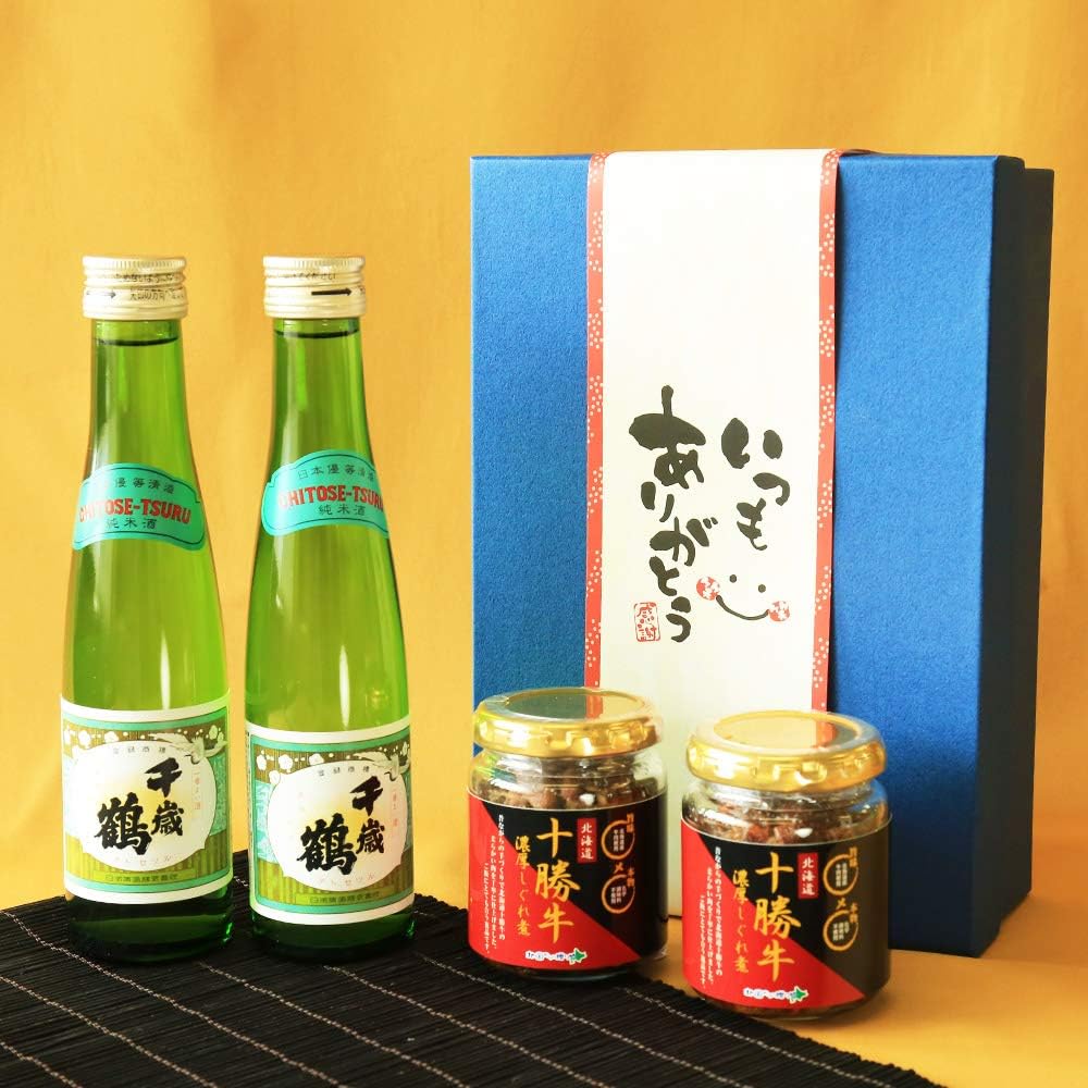 次にご紹介するおすすめのグルメギフトは「十勝牛しぐれ・日本酒千歳鶴 贅沢ギフトセット」です。