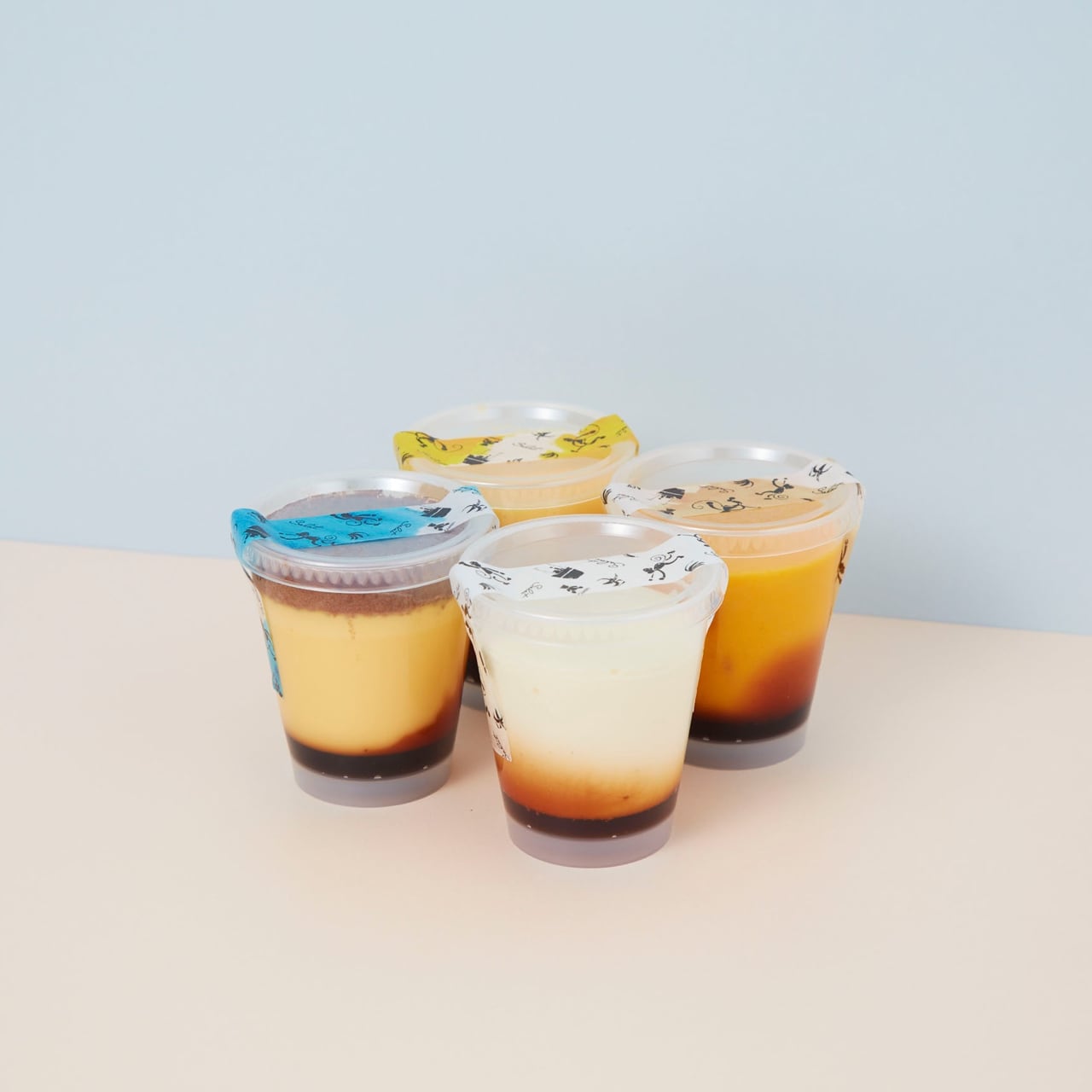 フレーバーはソースなしのプレーン、フルーツがたっぷりのソースがかかったいちご、マンゴー、ベリーチーズの全4種類。それぞれのフルーツが活かされたプリンを、ぜひお試しください。