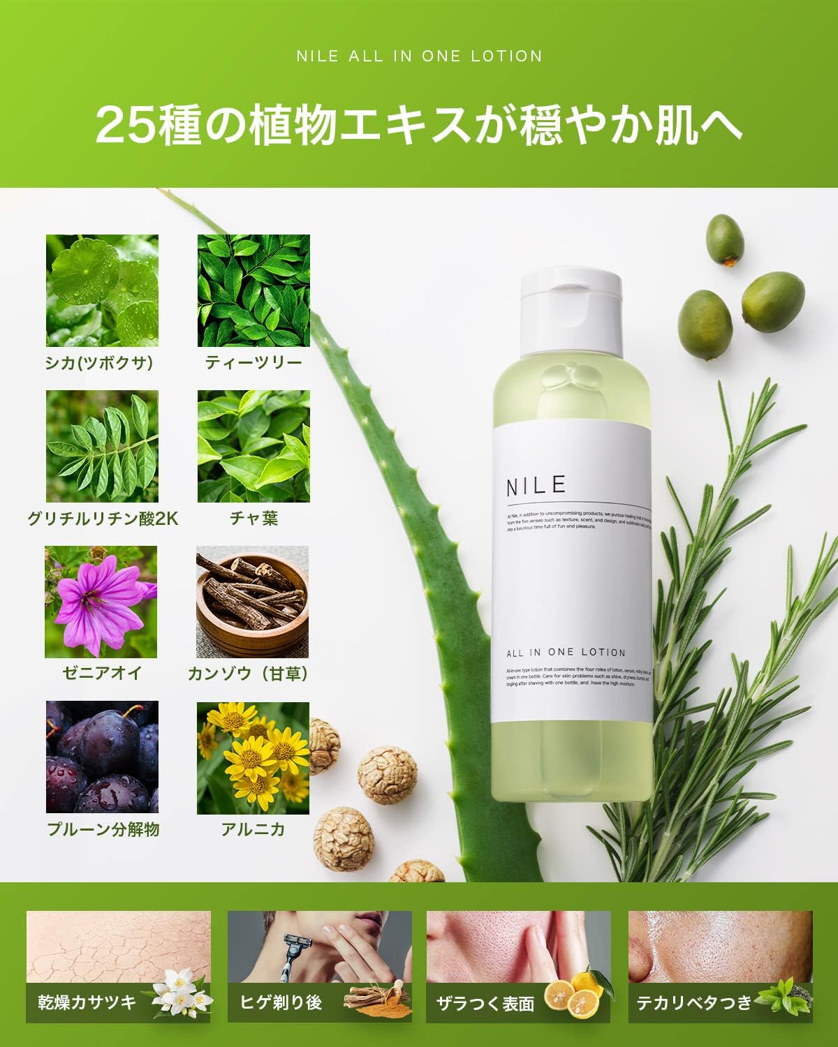 20代のメンズにおすすめの化粧水『Nile』の「オールインワンスキンケアローション」。植物エキスをメインにした、潤いたっぷりの使い心地が特徴の商品です。