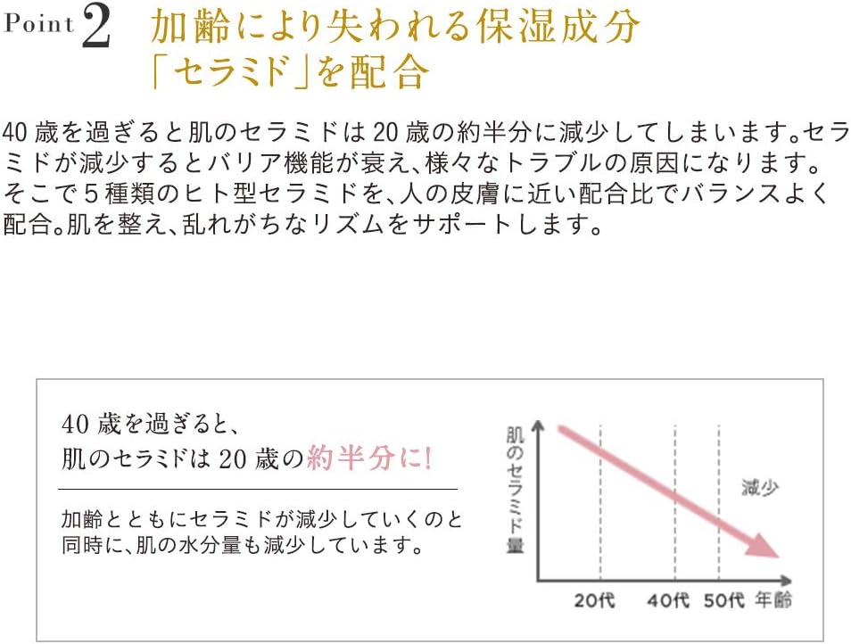 5種類のヒト型セラミド(※)が配合されており、季節の変わり目や年齢によって乾燥した肌にうるおいを与えます。