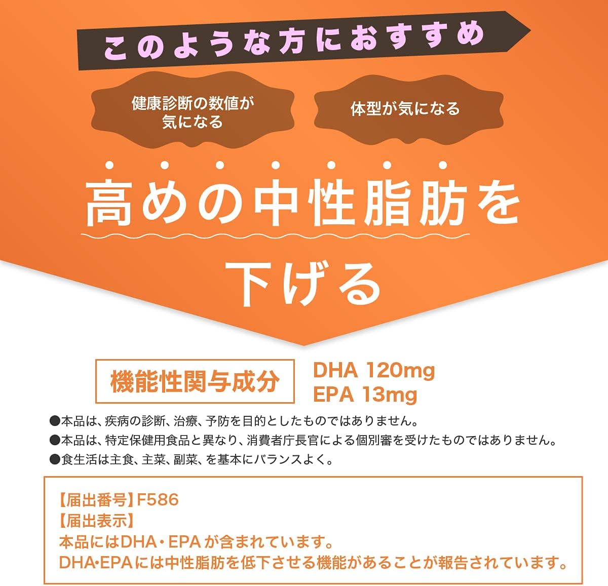 | 届出表示 | 本品にはDHA・EPAが含まれます。 DHA・EPAには血中の中性脂肪値を低下させる機能があることが報告されています。 |
