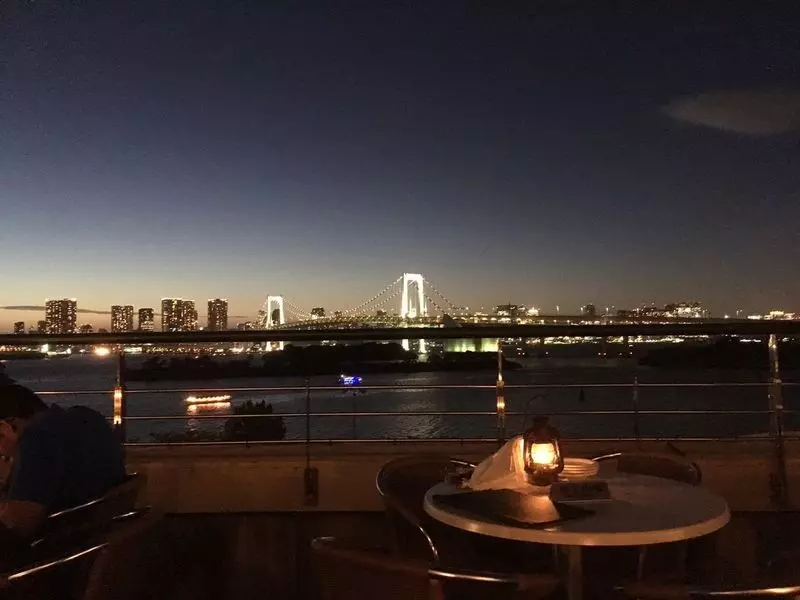 このテラス席では、夜になるとお台場のレインボーブリッジと高層ビル群の夜景を楽しみながらディナーをすることができます。