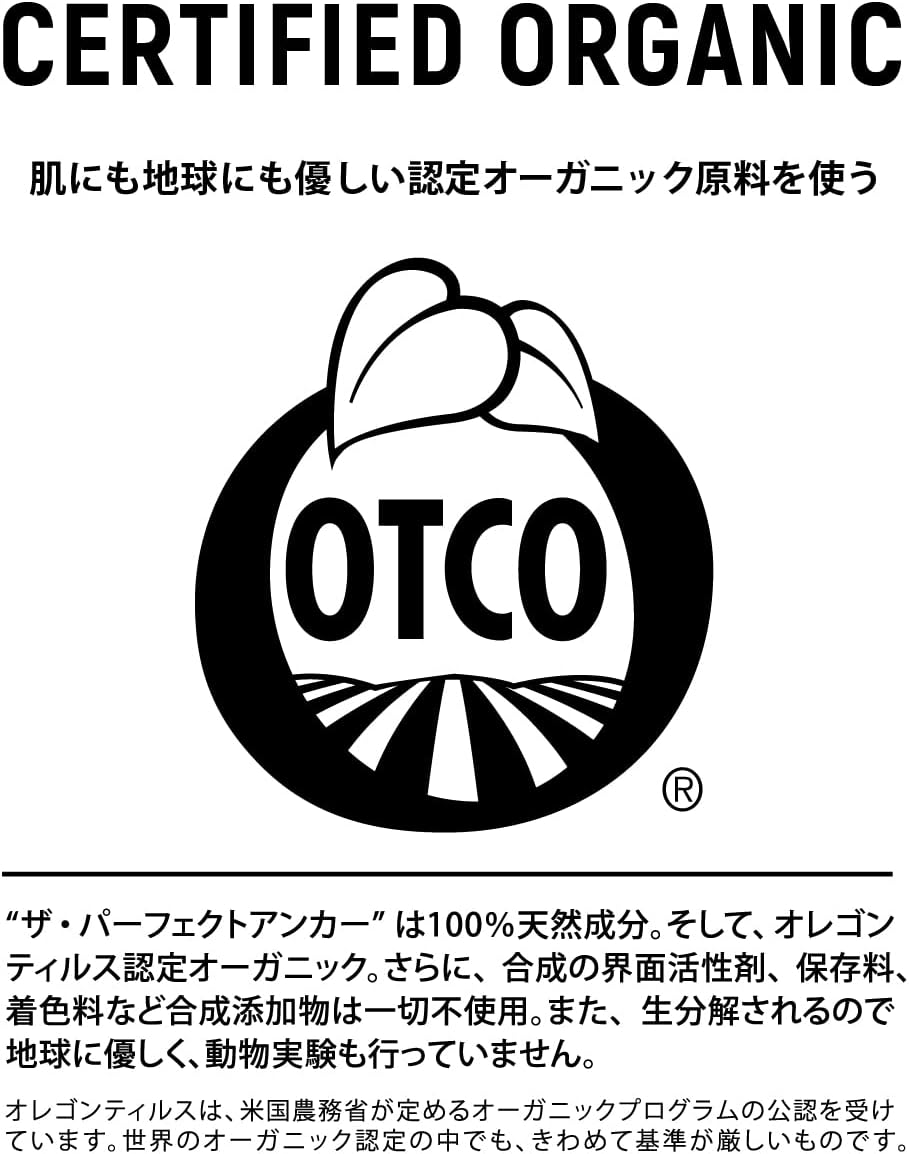 特徴は100%天然成分を使用しているため、香料、着色料、活性剤などの添加物が入っていないところ。植物由来の成分で肌を保湿してくれるため、肌に優しいのが嬉しいポイントです。(※"ザ・パーフェクトアンカー 公式HP"参照)