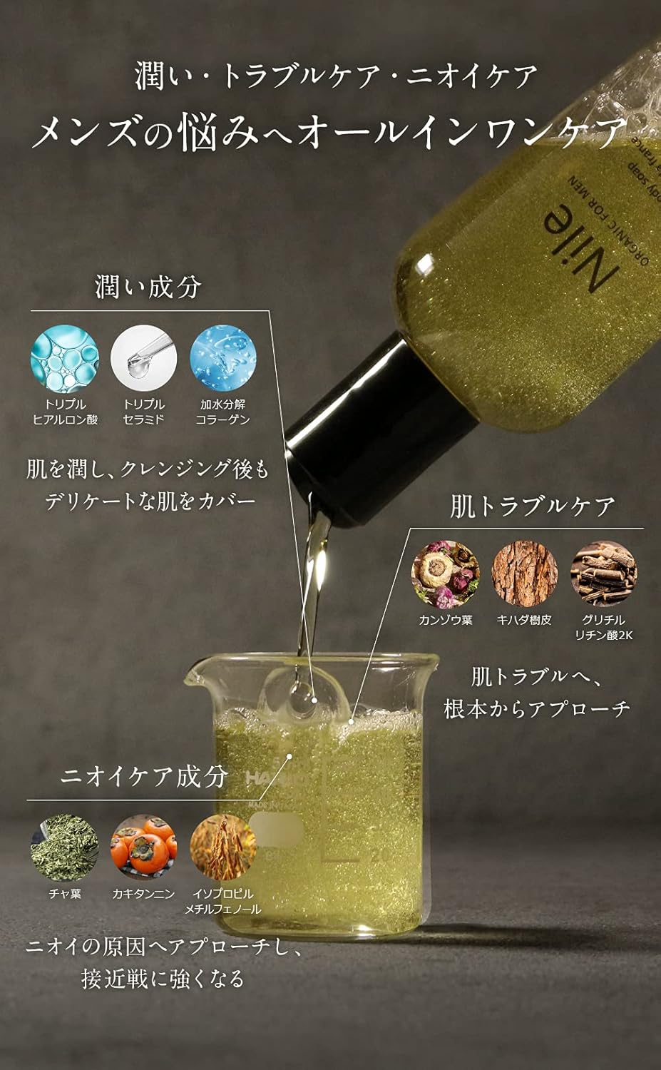 続いてご紹介する加齢臭対策におすすめのボディソープは、Nileの「クレンジング ボディーソープ」。こちらは男性だけでなく女性にもおすすめのメンズ向けボディソープです。