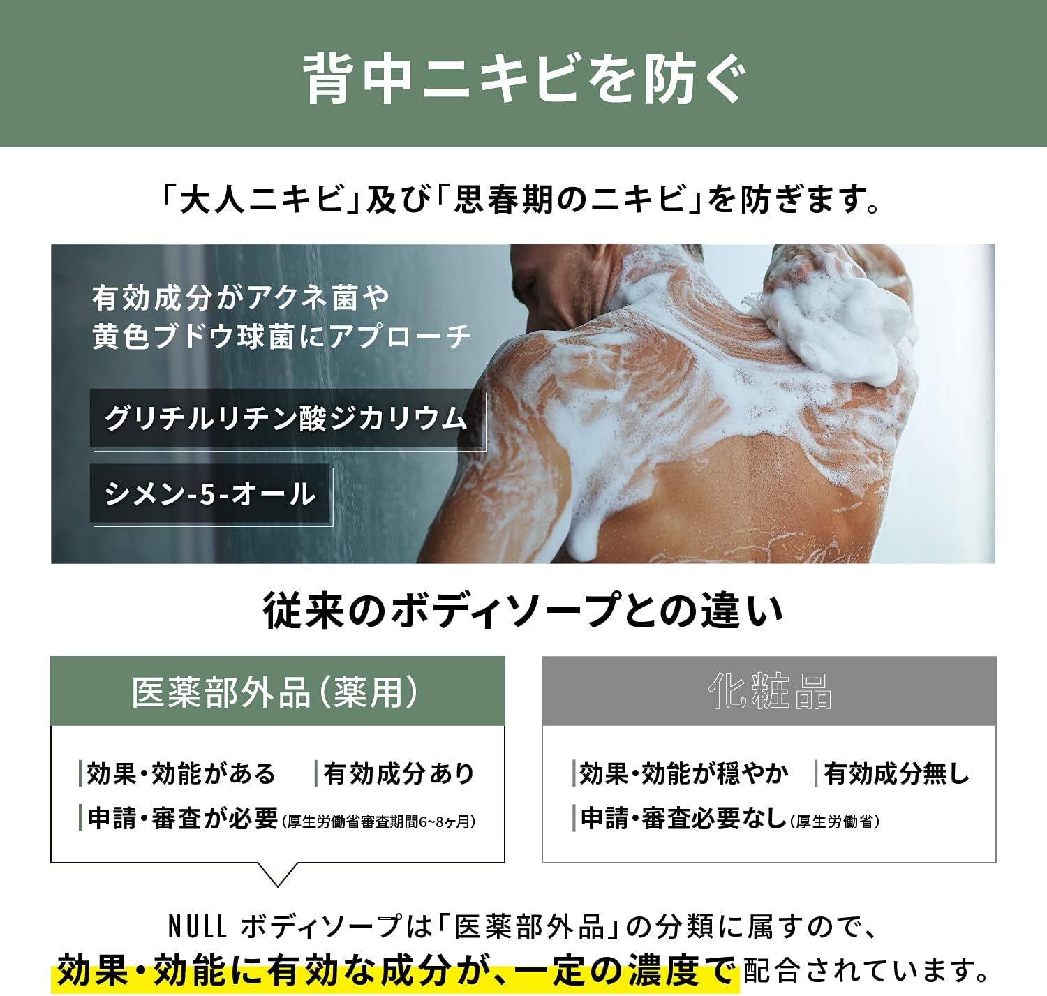 この商品の特徴は匂い対策だけでなく、ニキビ予防に良いとされるグリチルリチン酸ジカリウム(※)が配合されているところ。自分ではケアしにくい背中ニキビ対策もできるためおすすめです。(※"NULL 公式HP"参照)