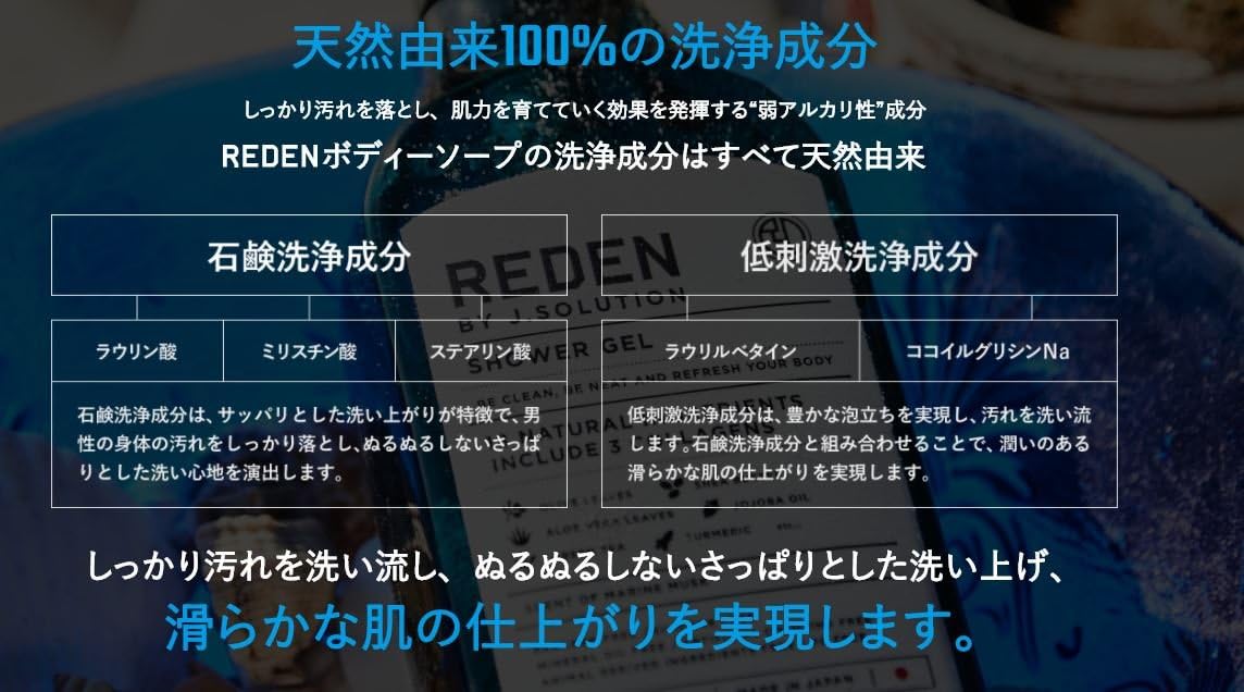 3種類の石鹸系洗浄成分(※1)と2種類の低刺激洗浄成分(※2)で優しく体を洗い流してくれるのが特徴。さらにカキタンニン(※3)配合で、匂い対策もしてくれます。オーガニックな加齢臭対策できるボディソープを探している方におすすめです。(※"REDEN 公式HP"参照)