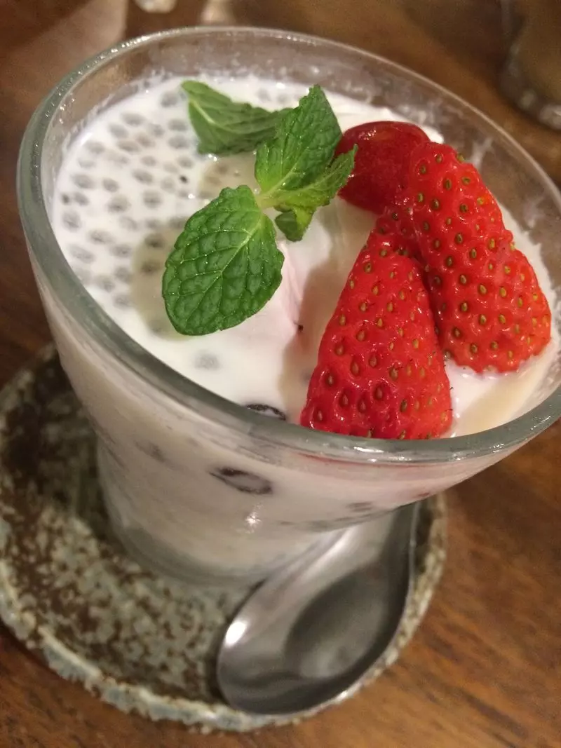 例えば、「マンゴーともち米」。マンゴーともち米を一緒に食べるタイの定番デザート。「苺とタイ風ココナッツぜんざい」はココナッツミルクベースに苺と黒米が入っているもの。お米と甘いフルーツを一緒に食べるなんて日本では考えられませんが、これが案外相性が良く、プチプチとしたお米の食感がなんとも美味しい!