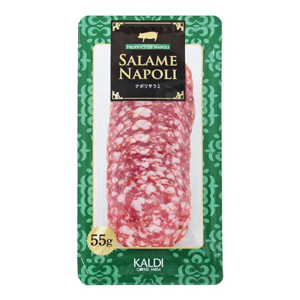 「ナポリサラミ」は南イタリアを代表するおつまみで、地元の食卓には欠かせない生ハムです。封を開けると黒コショウが練り込まれた、薄切りで丸い形のサラミが並んでいます。カルディの「ナポリサラミ」の特徴は乳酸菌発酵させて仕上げていて、酸味をほのかに香る程度にとどめていること。(※"カルディ 公式HP"参照)