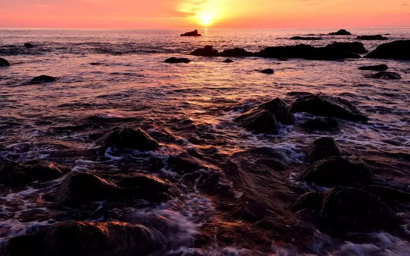 広大な海と茜色に輝く夕日の絶景に、圧倒されます♪