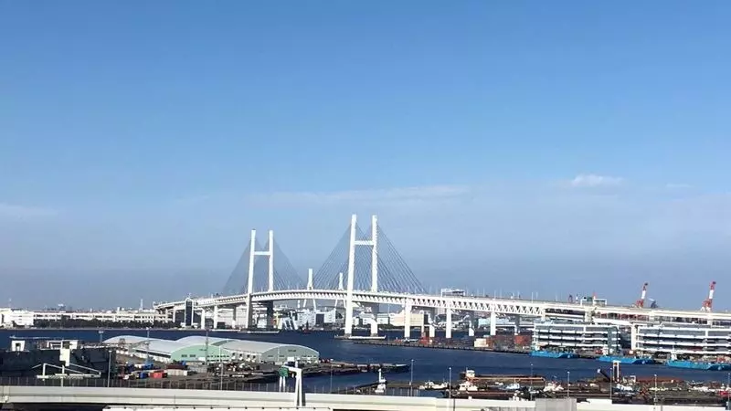 丘の上の展望台から見えるのは横浜ベイブリッジと横浜港。