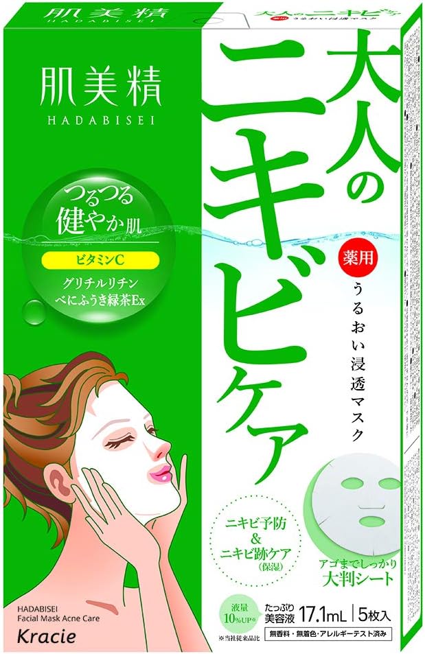 続いてご紹介するシートタイプのニキビケアパックは、肌美精の「うるおい浸透マスク(アクネ)」。1枚に美容液17.1mlを染み込ませたシートマスクです。消炎作用のあるグリチルリチン酸ジカリウム(※1)を始め、美白に有効とされるビタミンC誘導体、保湿成分べにふうき緑茶Exなどが乾燥が気になる肌に潤いを補います。(※"肌美精 公式HP"参照)