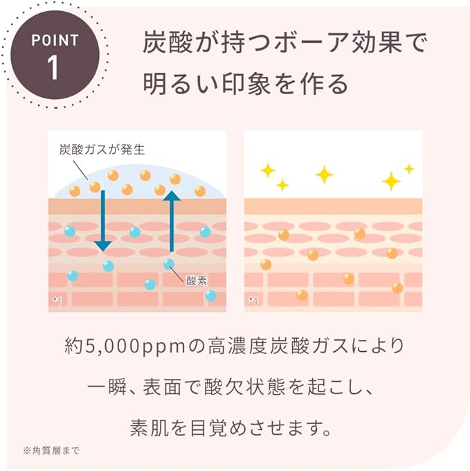 高濃度炭酸とヒアルロン酸(※1)、ローヤルゼリー(※1)の働きで、肌にハリ・ツヤ、潤いを与えてくれるのが特徴。肌にのせるとシュワッと弾け、じんわりとした温かさを感じられます。肌を明るく見せたい方や乾燥肌の方はぜひ試してみてください!