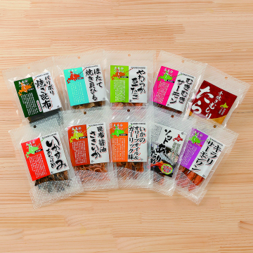 | 内容量 | ●いかすみあたりめ 22g ●手焼き昆布醤油さきいか 22g ●いかのオリーブオイル&ガーリック 22g ●ソフトあたりめ(さんま魚醤いり) 22g ●手焼きむしりたら 30g ●キラリサーモンワン 30g ●むきむきサーモン 33g ●やわらか豆たこ 33g ●ほたて焼き貝ひも 40g ●パリポリ焼き昆布 25g |