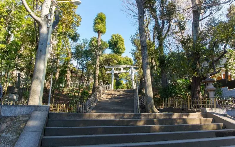 都会の喧騒を離れ、神社へ到着するとまず現れるのが立派な鳥居。こちらの階段を上ると奥に社殿が見えてきます。