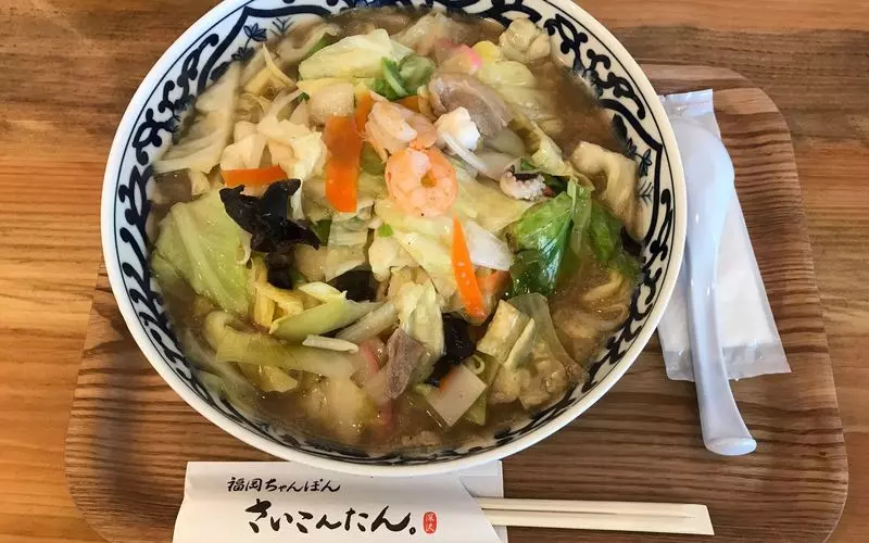 福岡ちゃんぽんは長崎ちゃんぽんと違って、中太の麺に和風のスープを使用。