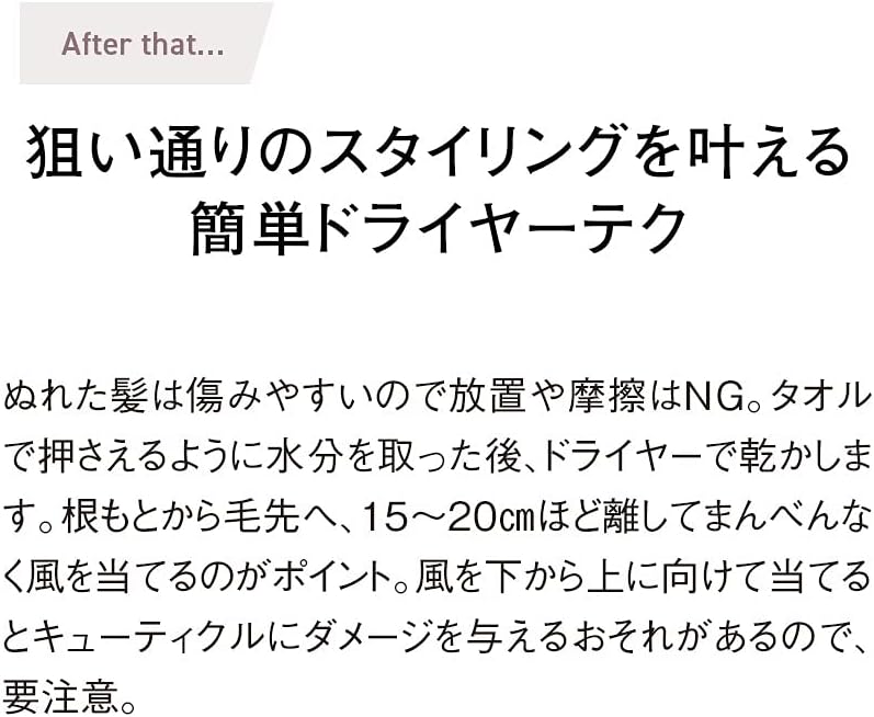 髪に潤いを補給し1本1本にハリやコシを与えてくれるのが特徴で、ナチュラルな仕上がりにしてくれると人気があります。髪のパサつきやうねり対策はもちろん、髪のボリュームアップをしたい方にもおすすめです。