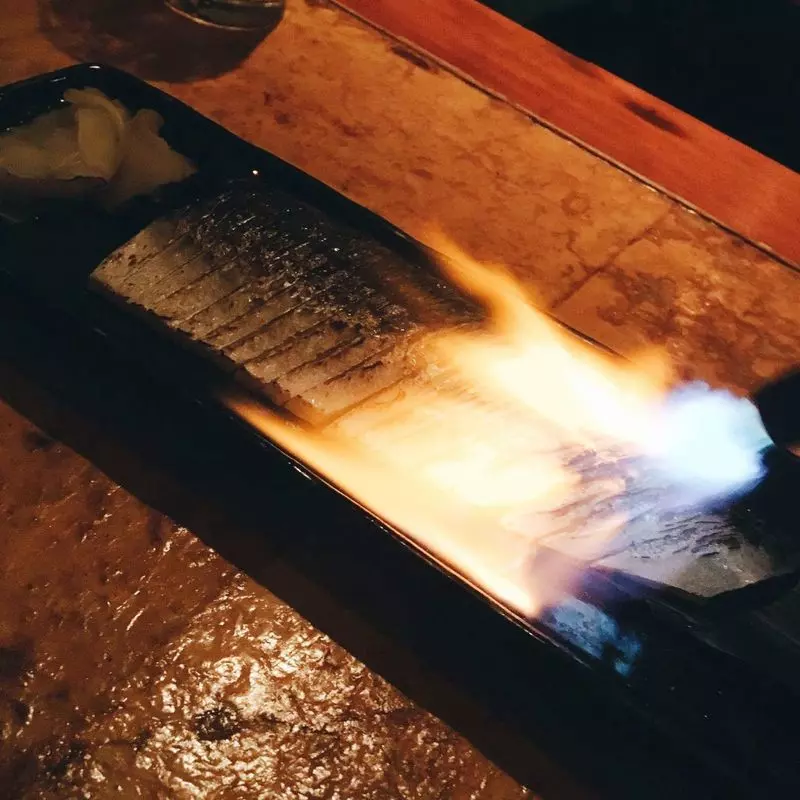 「ビストロ 三十五段屋」の注目メニューは、目の前で炙ってくれる「炙りしめ鯖」!このしめ鯖パフォーマンスは外国人にも人気が高く、これを見に来る人も多いんだとか。