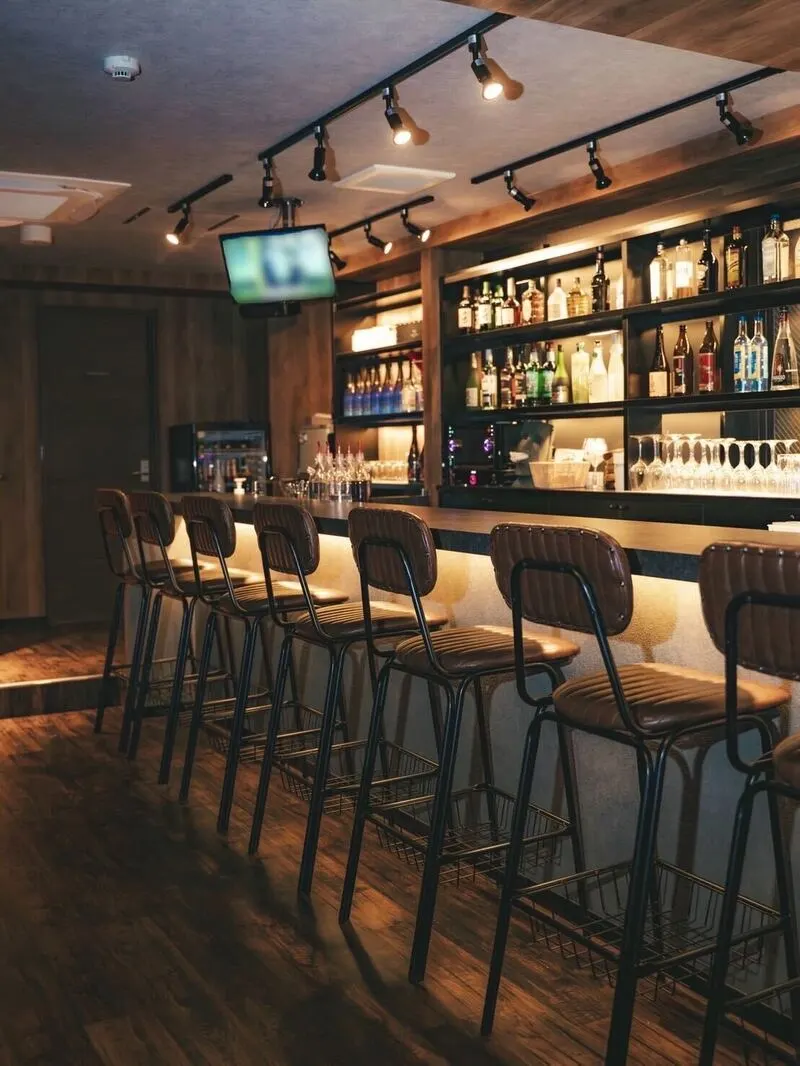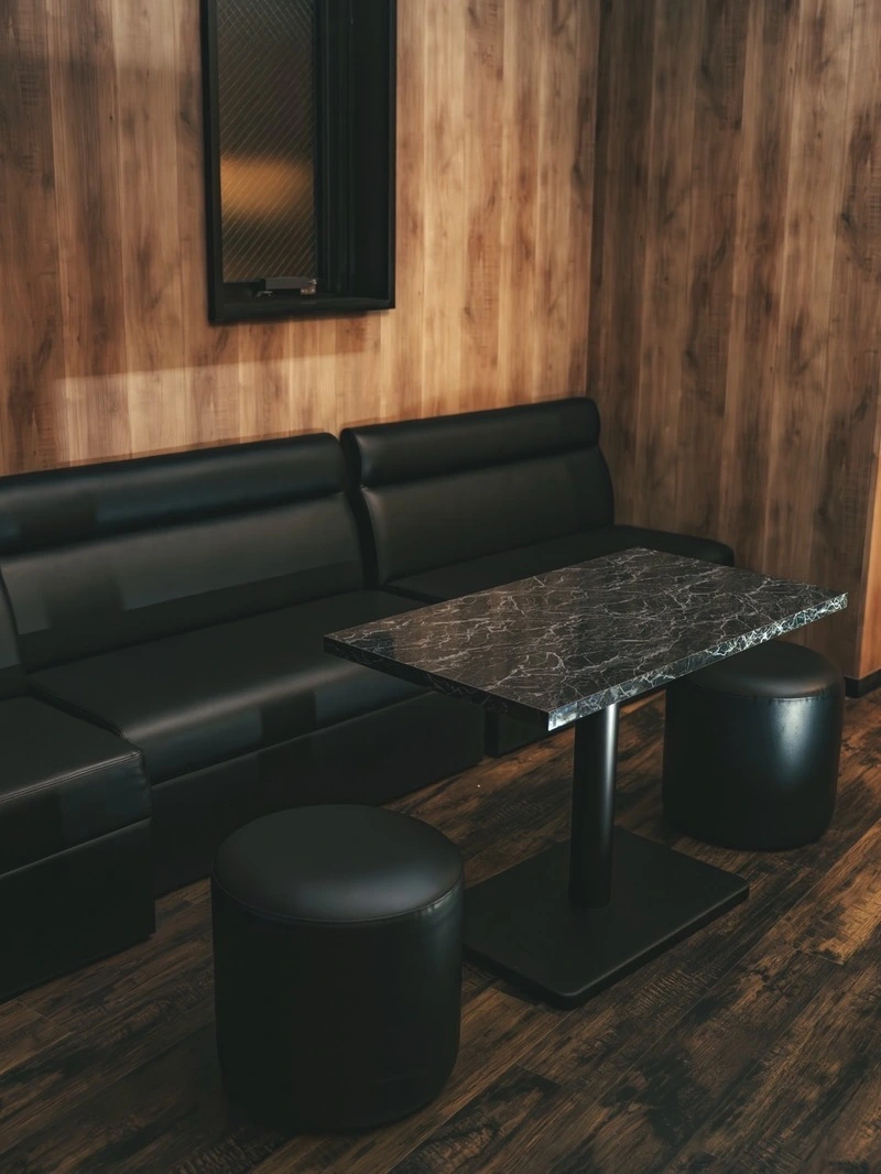 木目調のシックな空間が広がる店内には、スタイリッシュなカウンター席や広々としたソファー席があり、お酒を片手にカラオケも楽しめます。